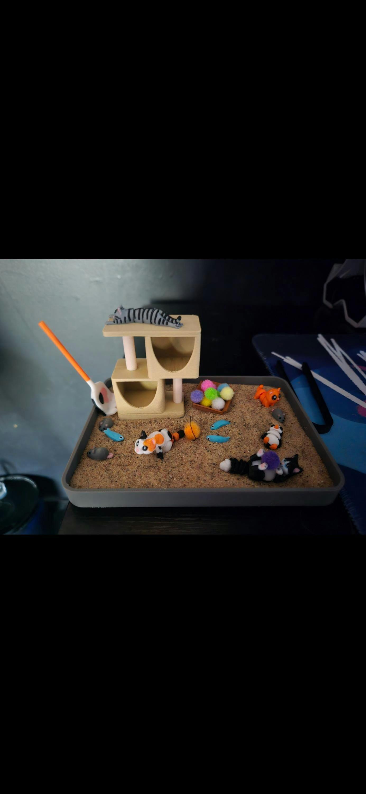 Enjoy a serene moment with this delightful 3D-printed Cat Zen Garden. Featuring a cozy cat tree, four adorable feline friends, and charming accessories like playful toy mice, fish toys, and even a tiny cardboard box, it's designed to bring a heartwarming touch of tranquility to your day. Perfect for your desk as a relaxing focal point or at home as a whimsical conversation starter, this zen garden offers a comforting spin on traditional relaxation.