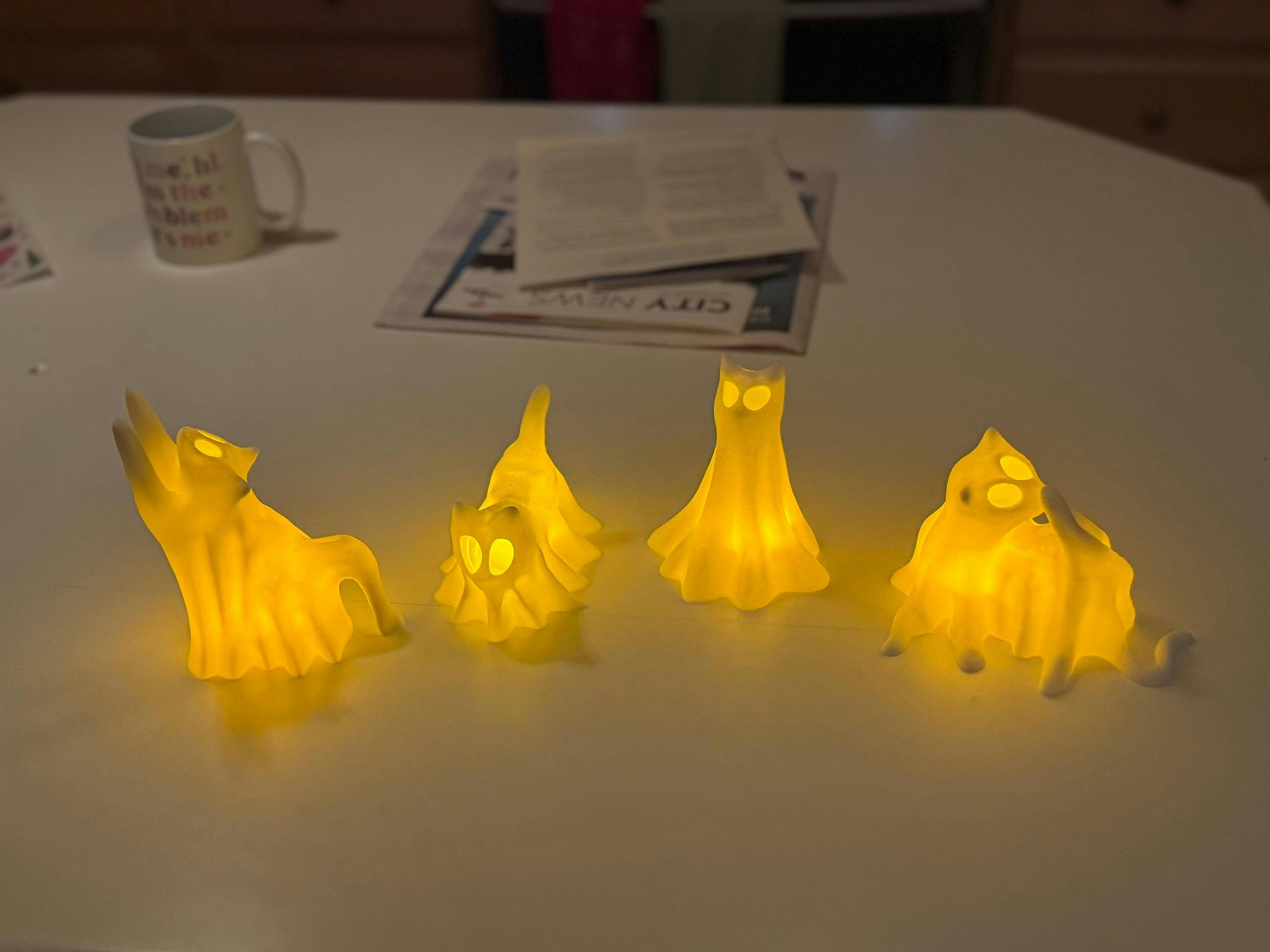 Ghost Cats with LED Tea Lights - Halloween Home Decor - Gifts for Cat Lovers - Office Desk Autumn Decor - 3D Printed Ghost Pet Night Light
